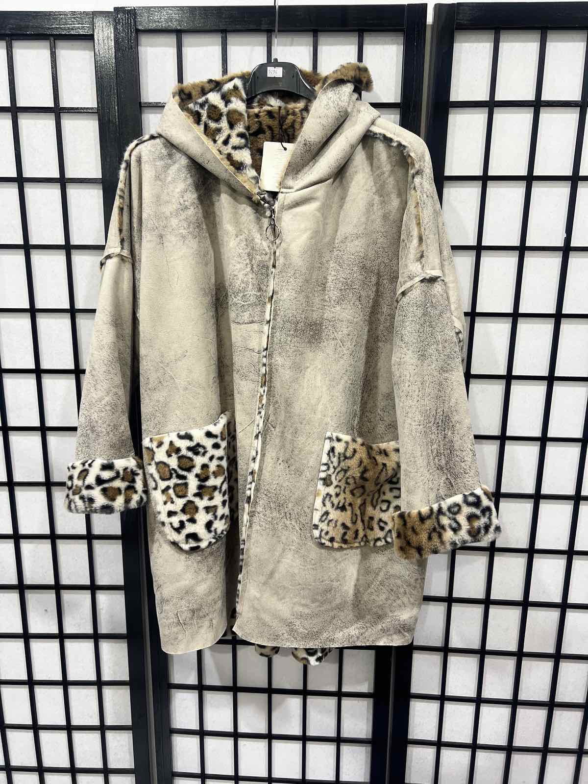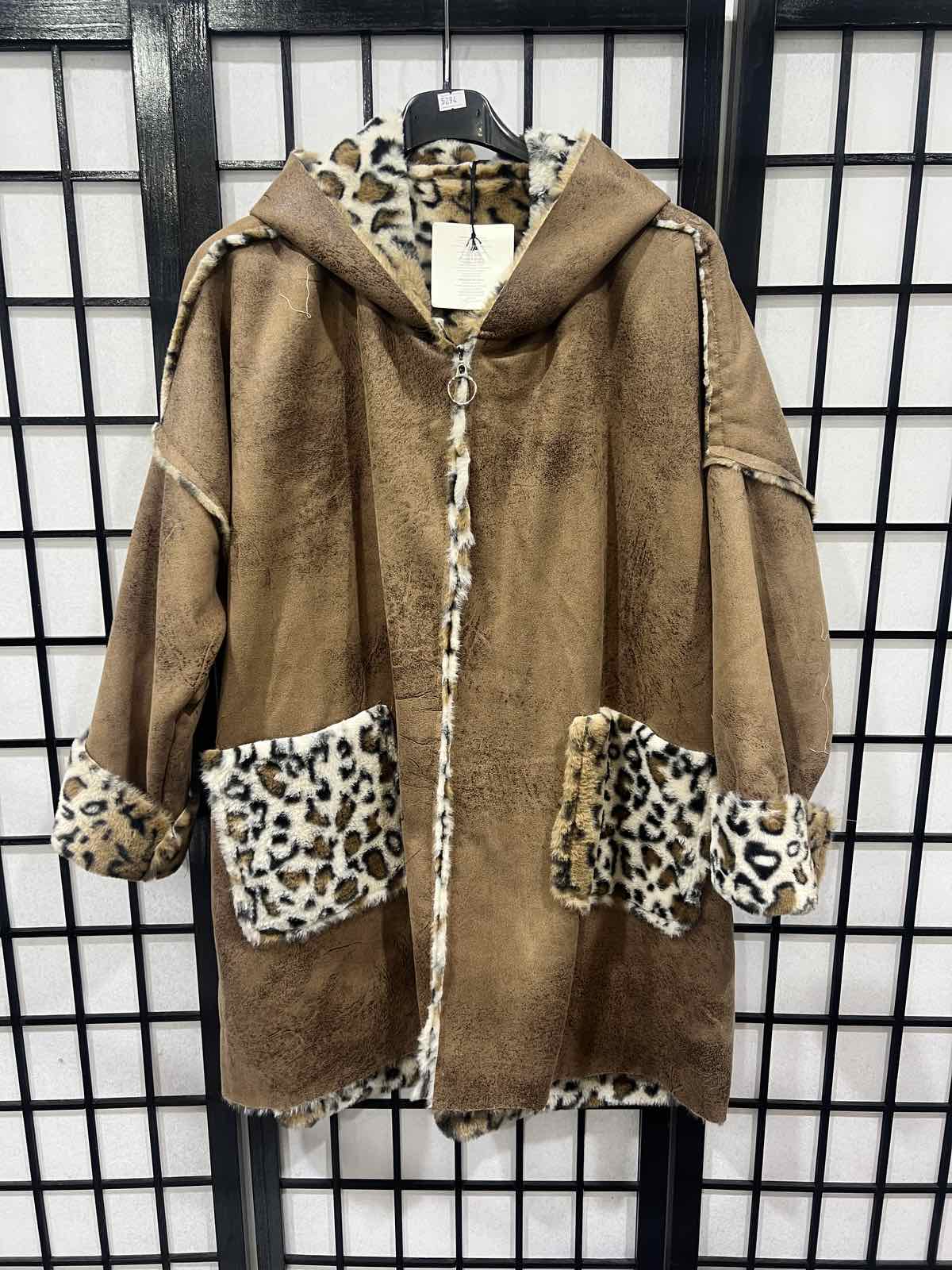 Italian Leopard Print Fur Hooded Zip Jacket With Pockets- 5294