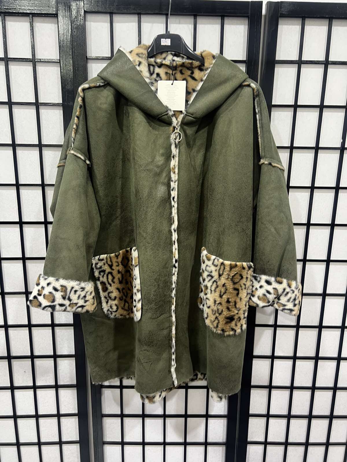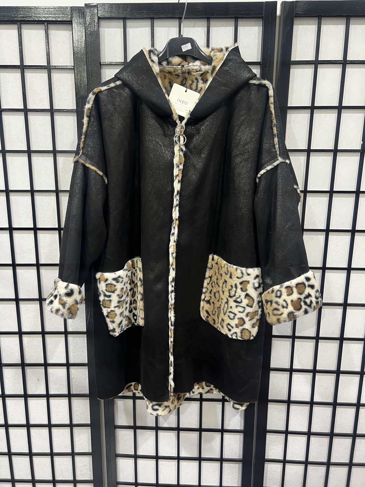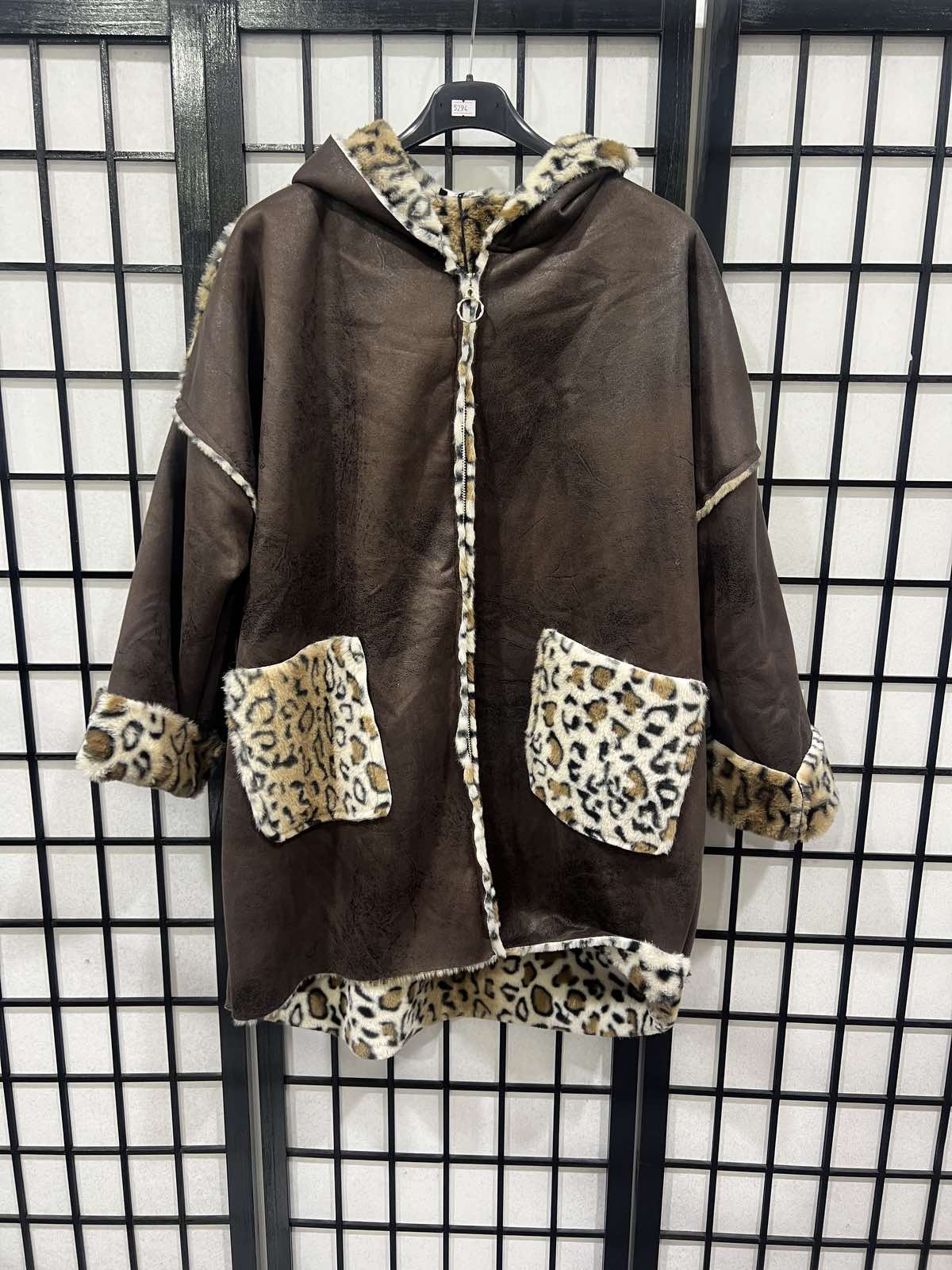 Italian Leopard Print Fur Hooded Zip Jacket With Pockets- 5294