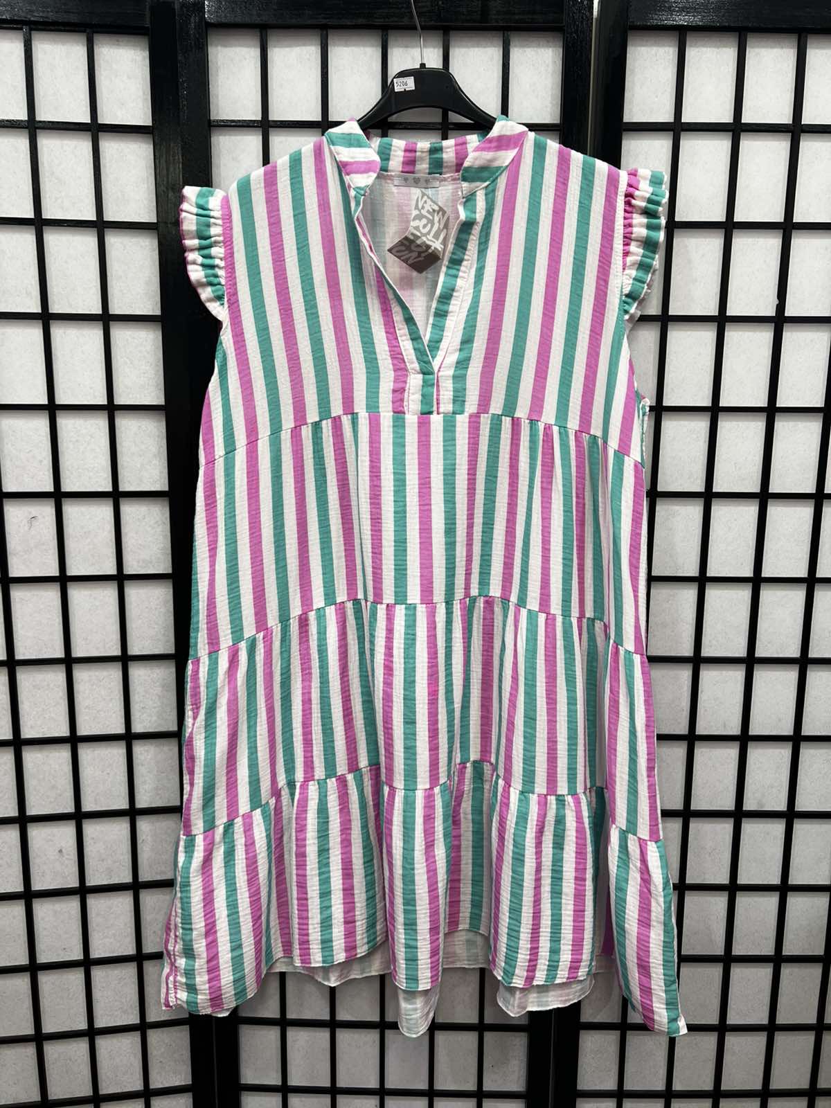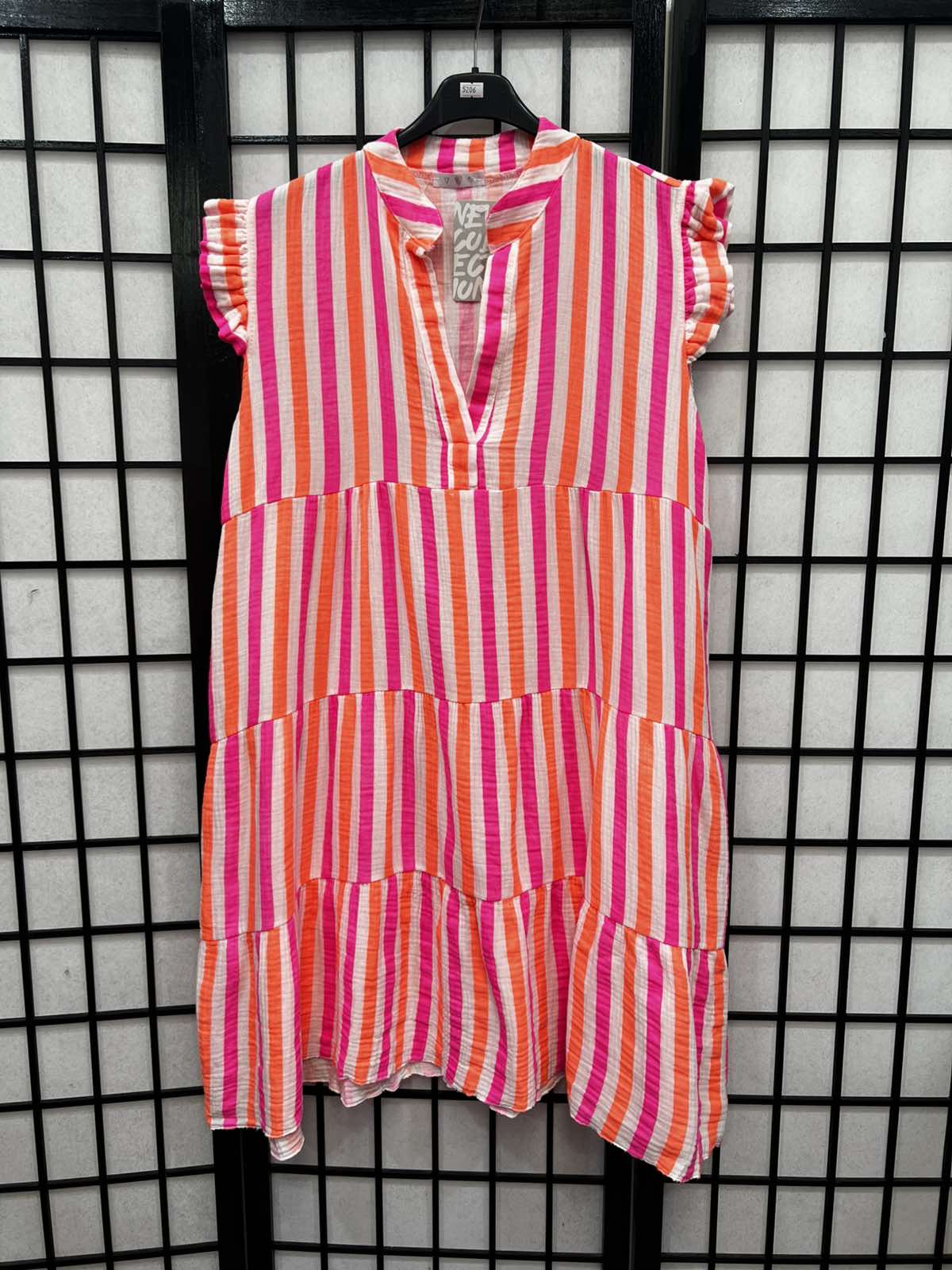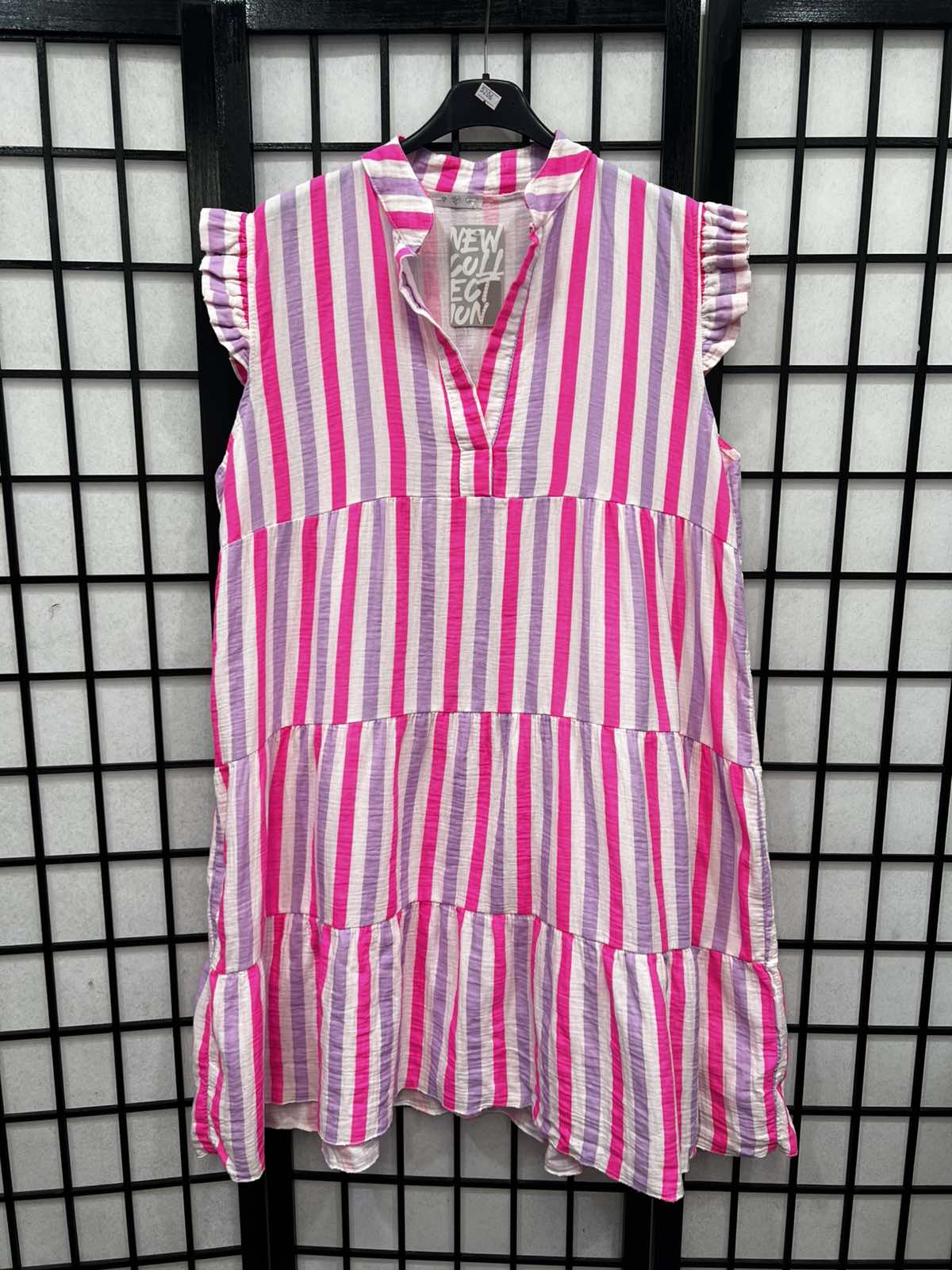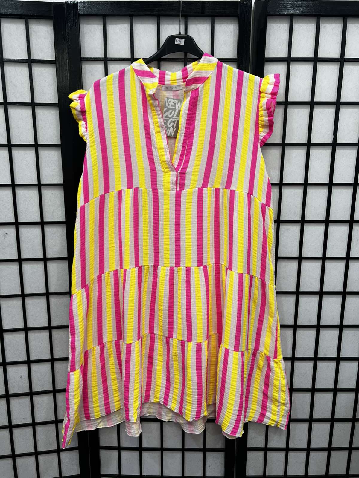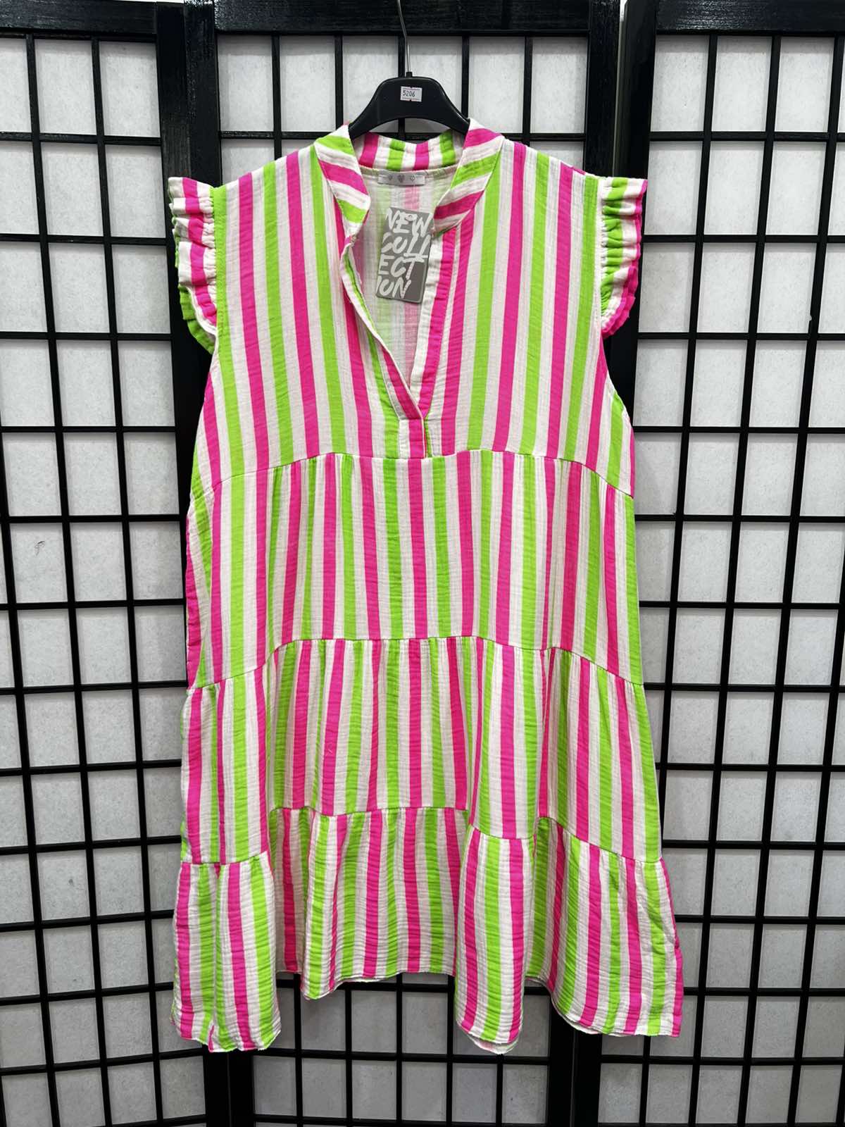 Italian V Neck Stripe Tiered Sleeve Dress With Frill -5206