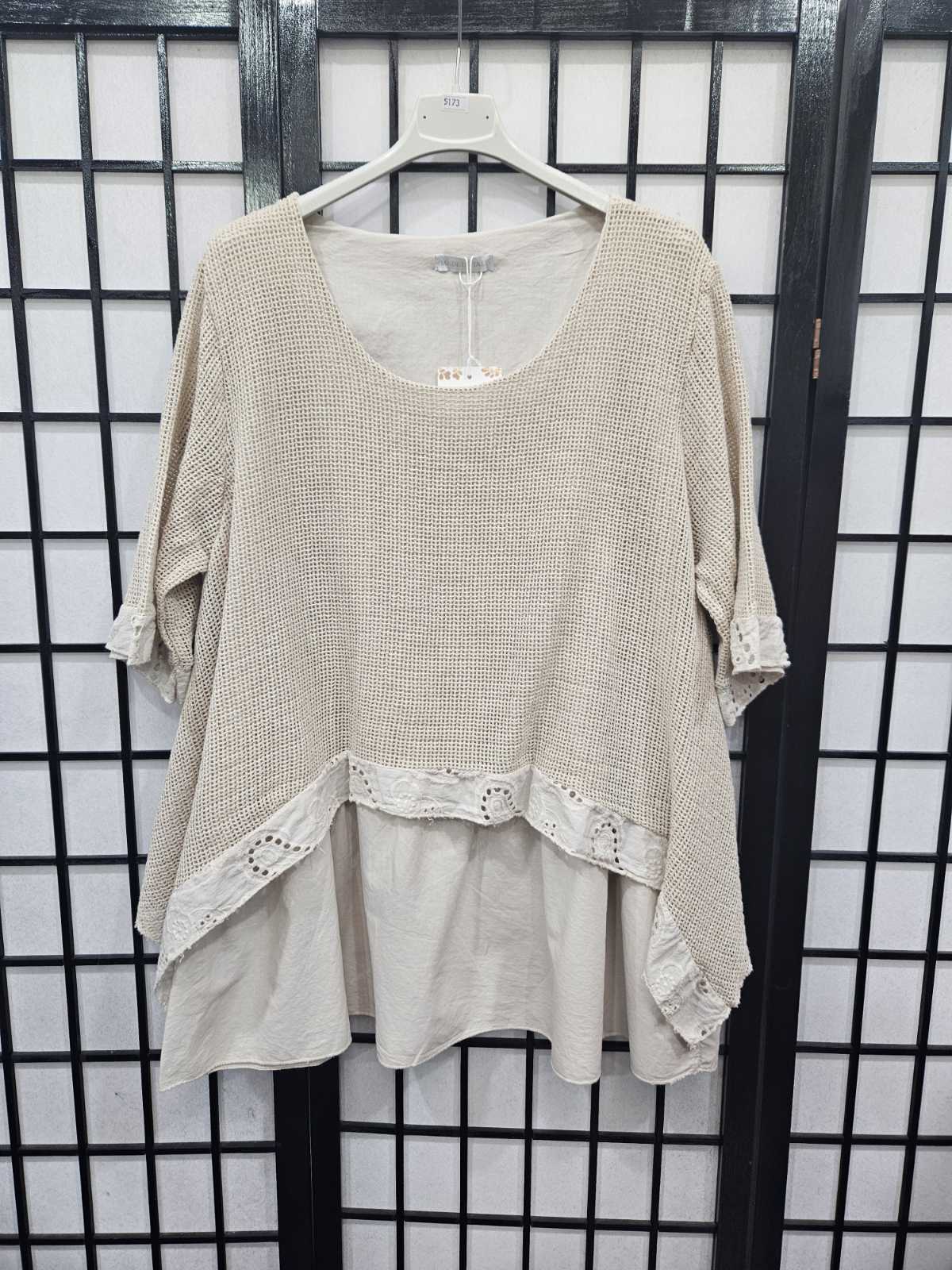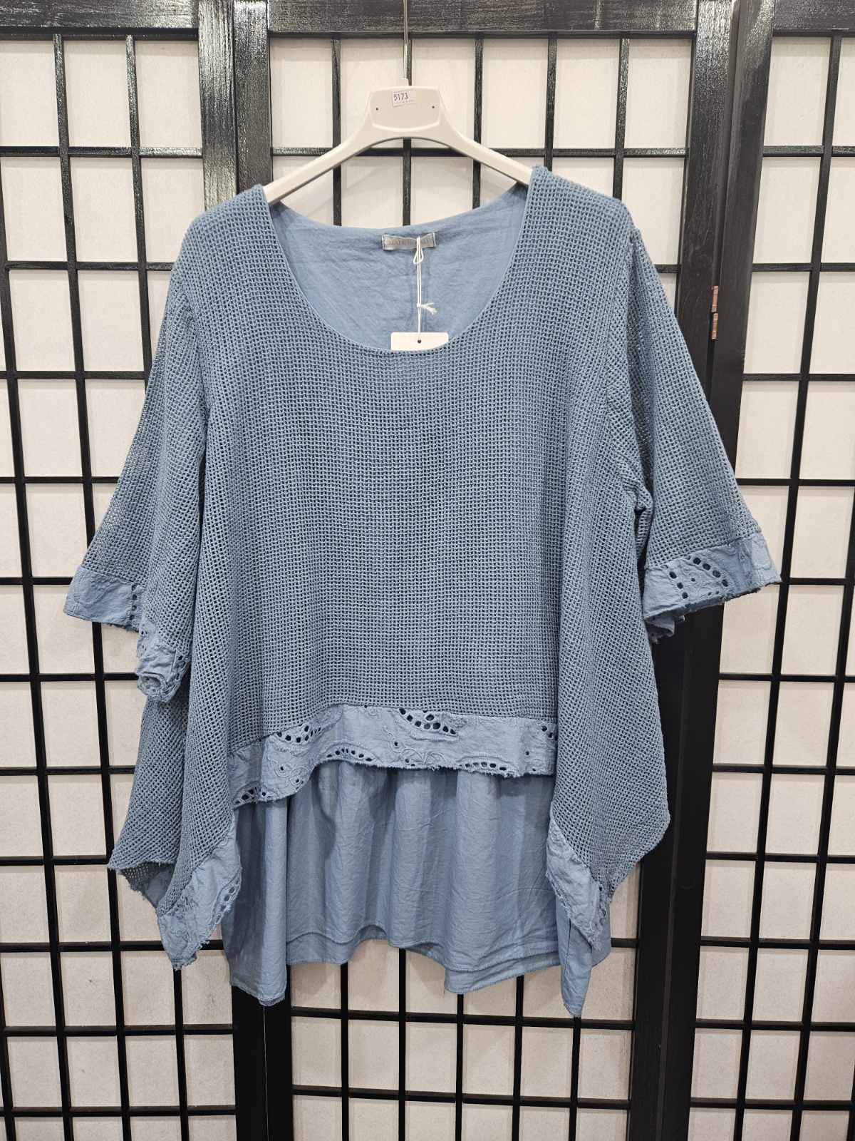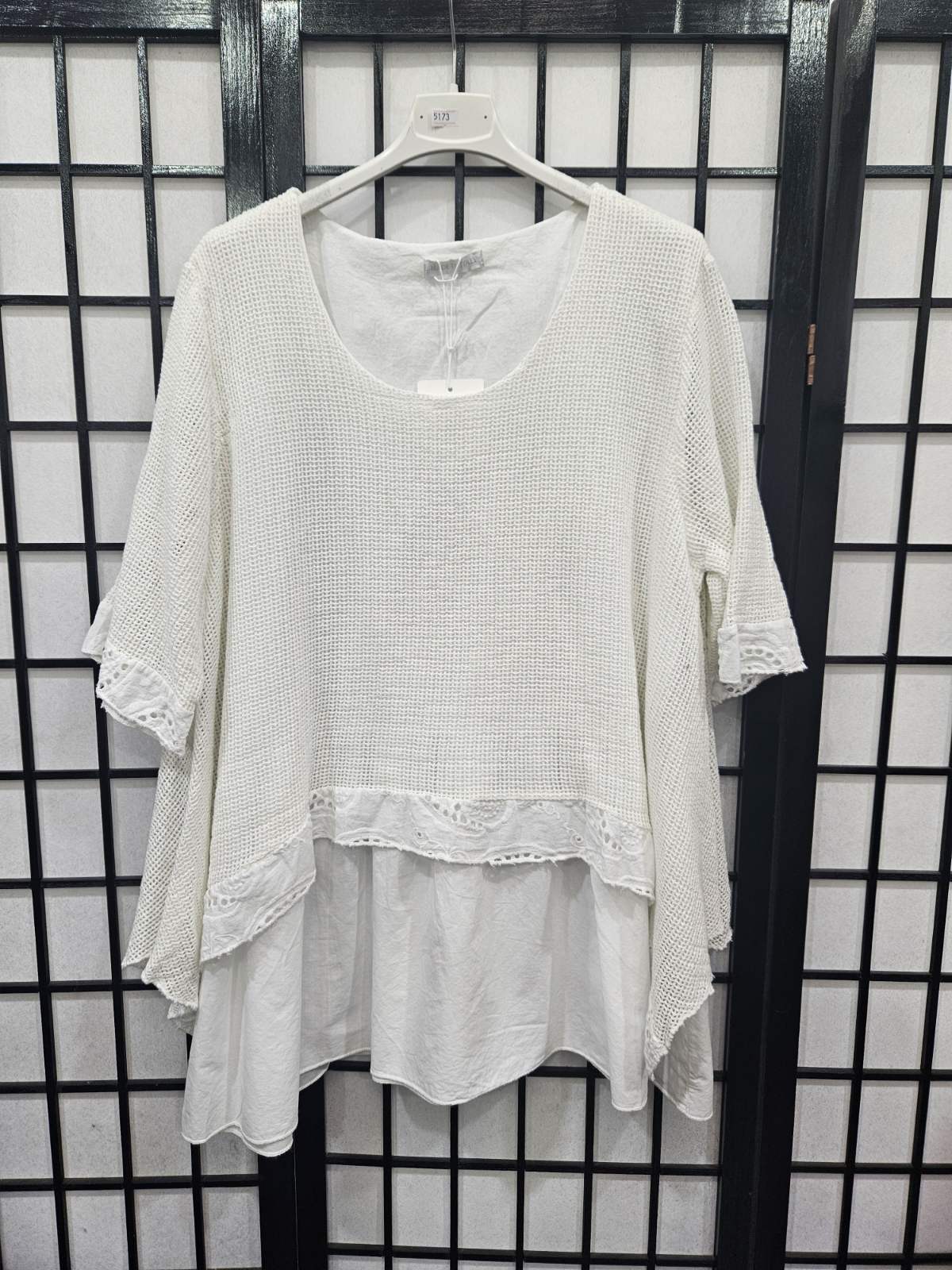 Italian Short Sleeve Mesh Top With Embroidery Anglaise Detail And Plain Cotton Layer - 5173