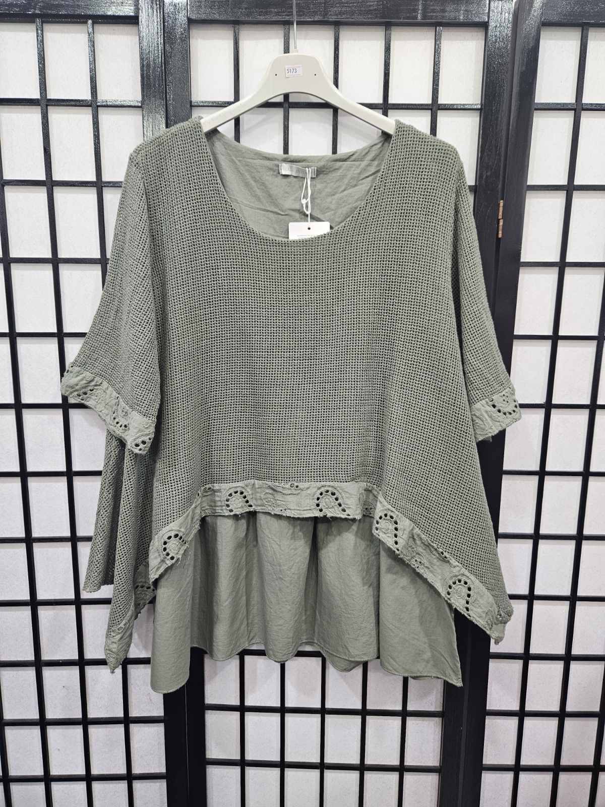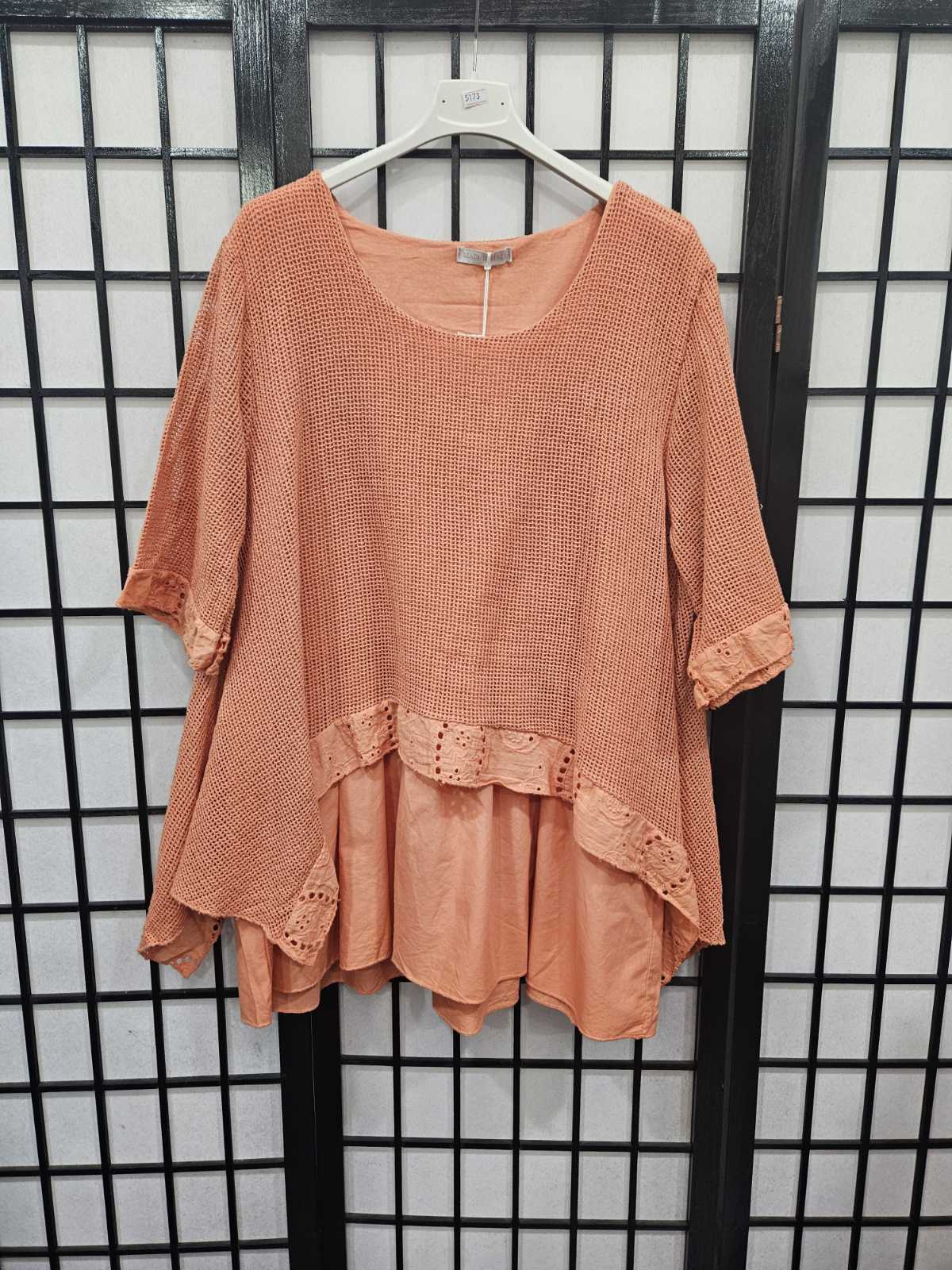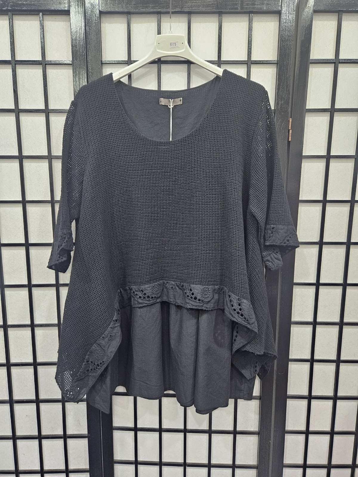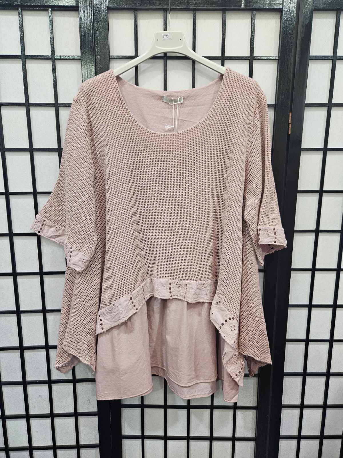 Italian Short Sleeve Mesh Top With Embroidery Anglaise Detail And Plain Cotton Layer - 5173