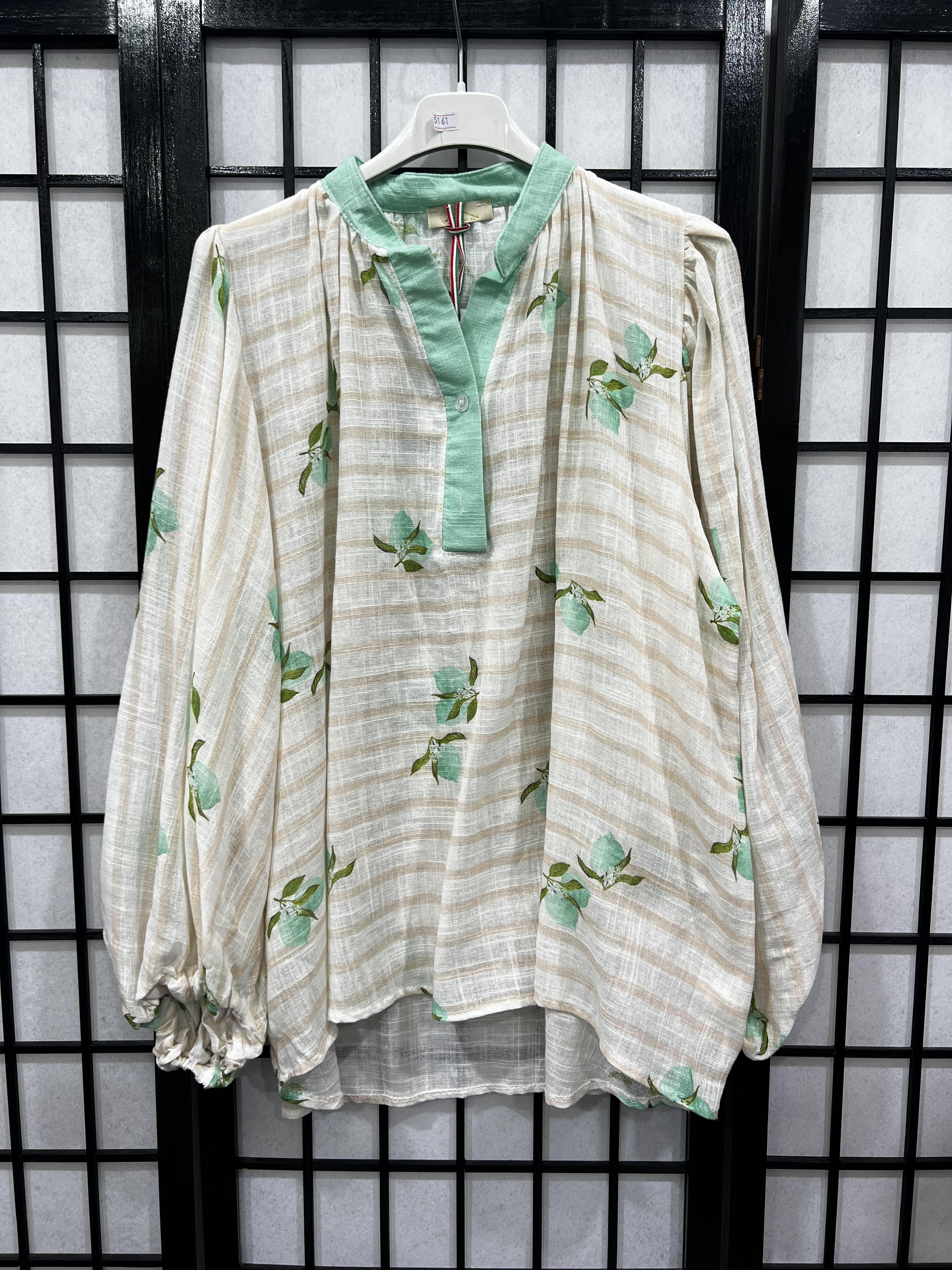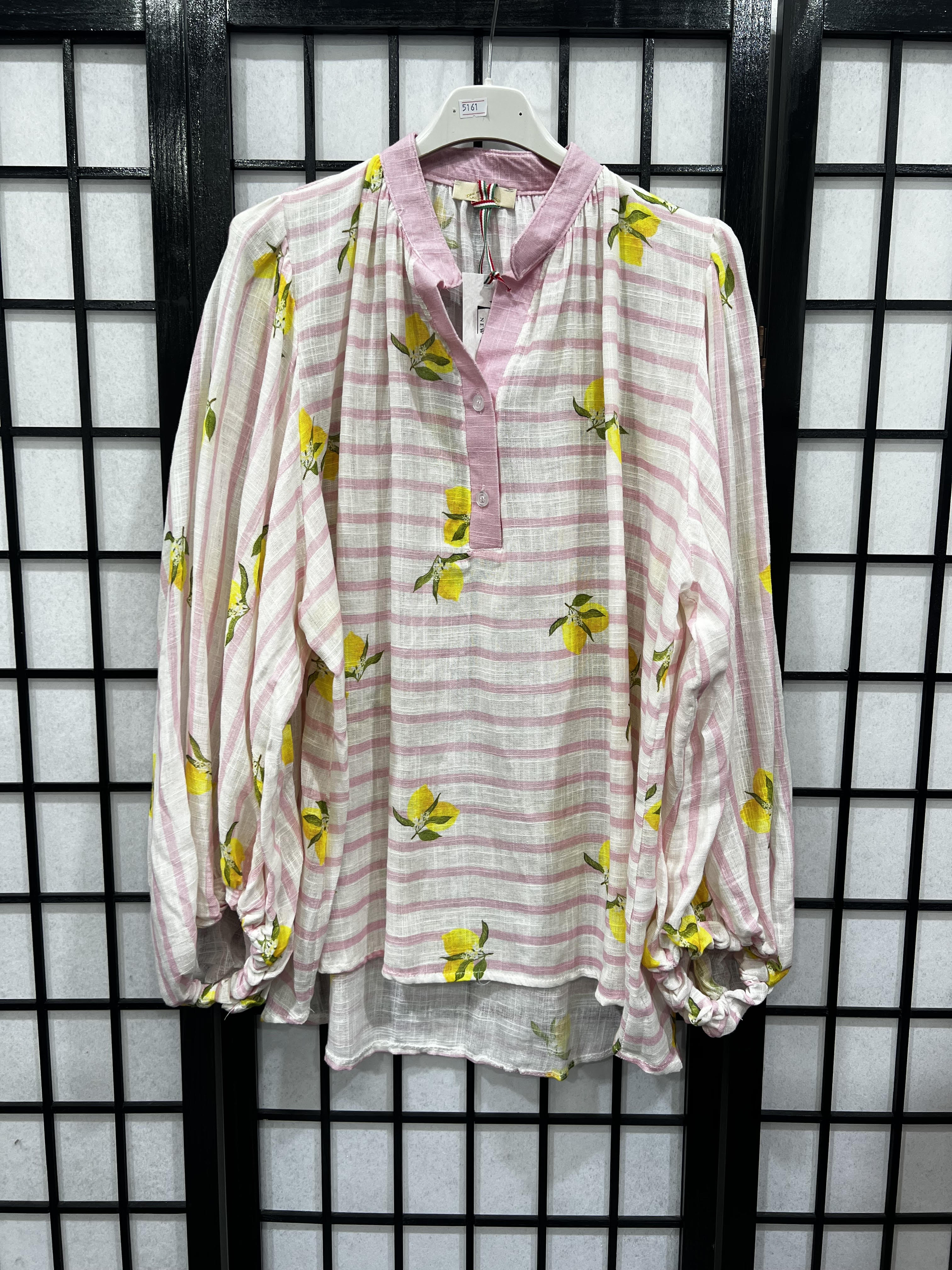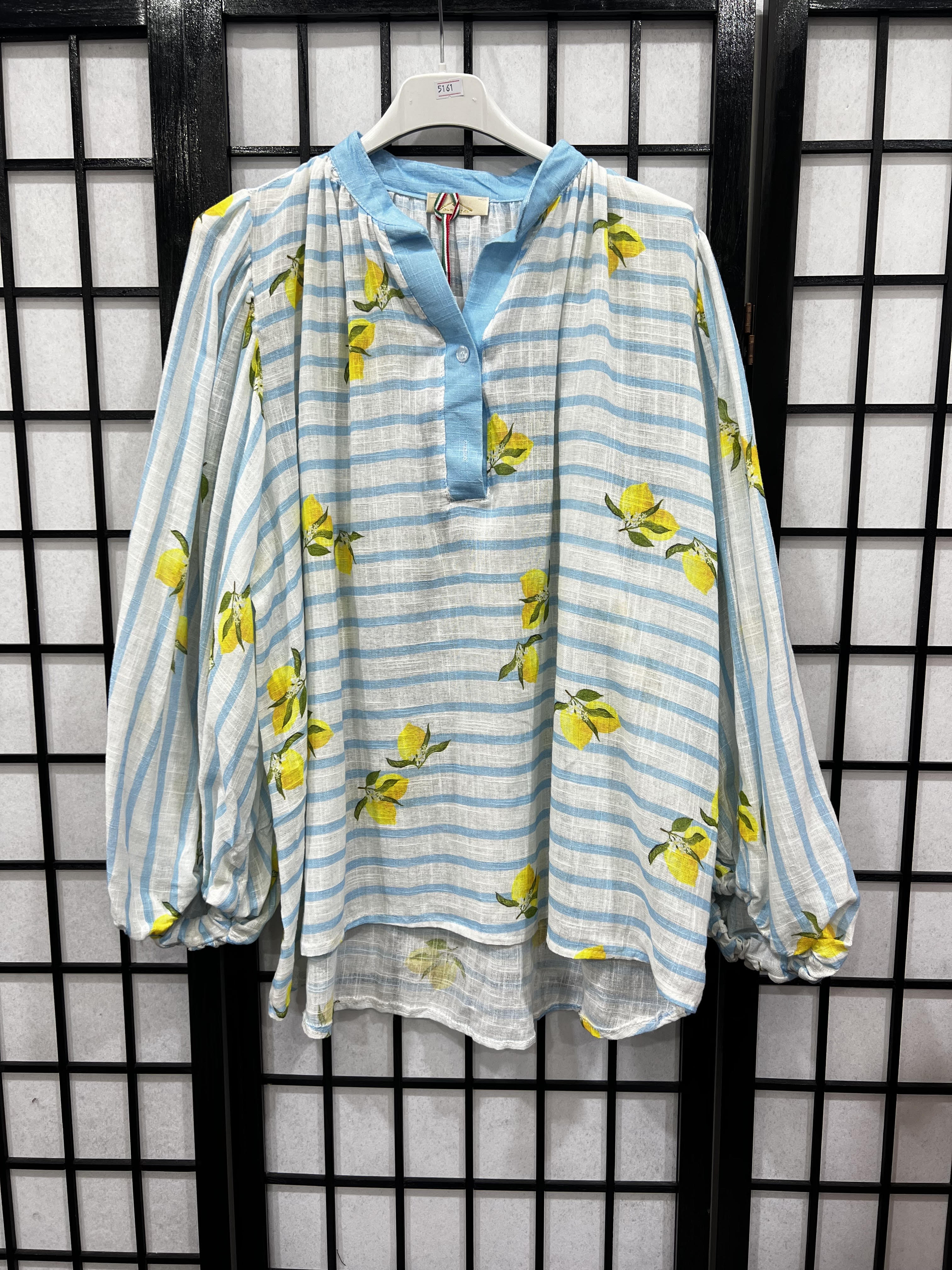 Italian Stripe and Lemon Print Cotton Top With Elasticated Cuff-5161