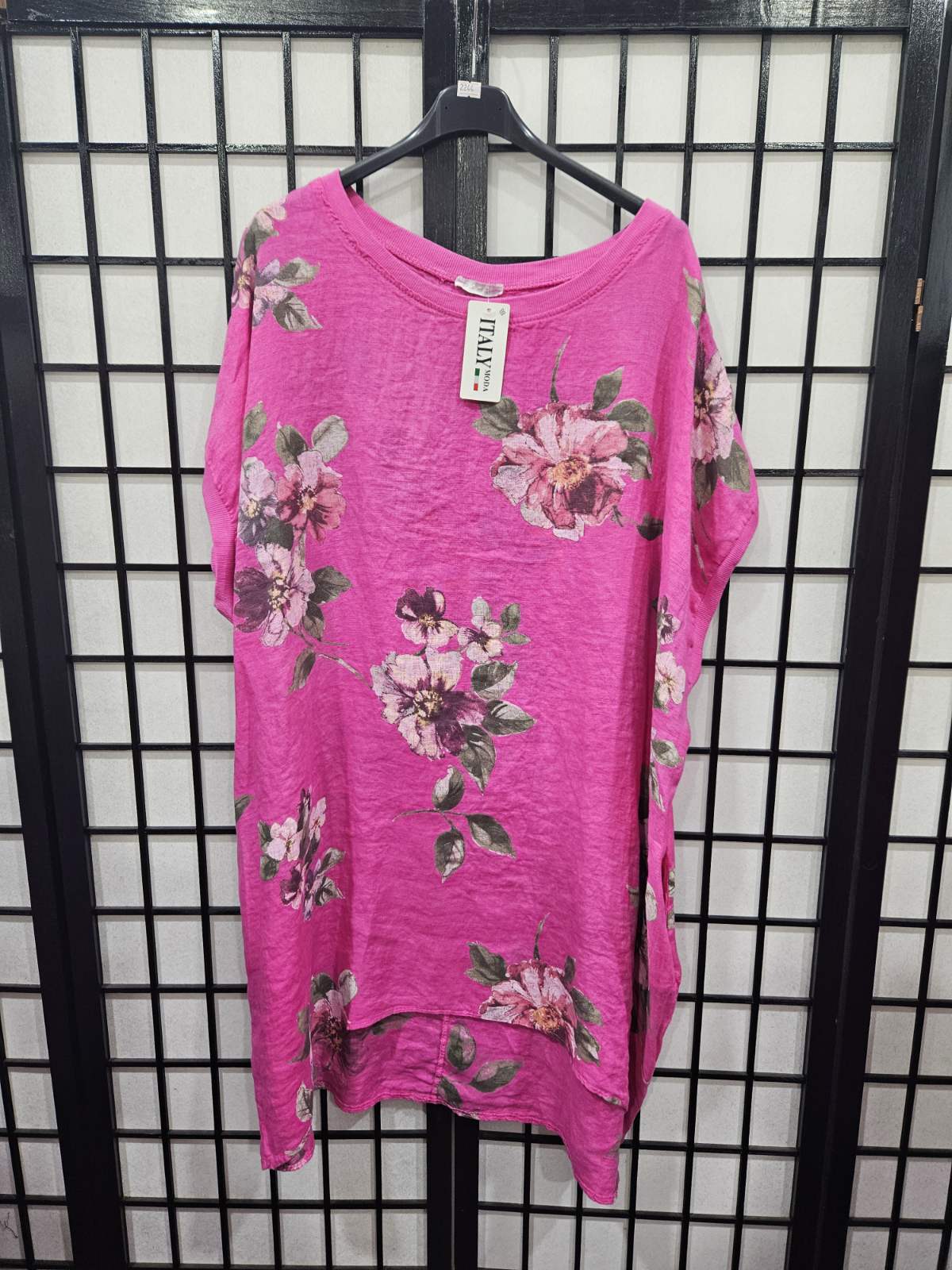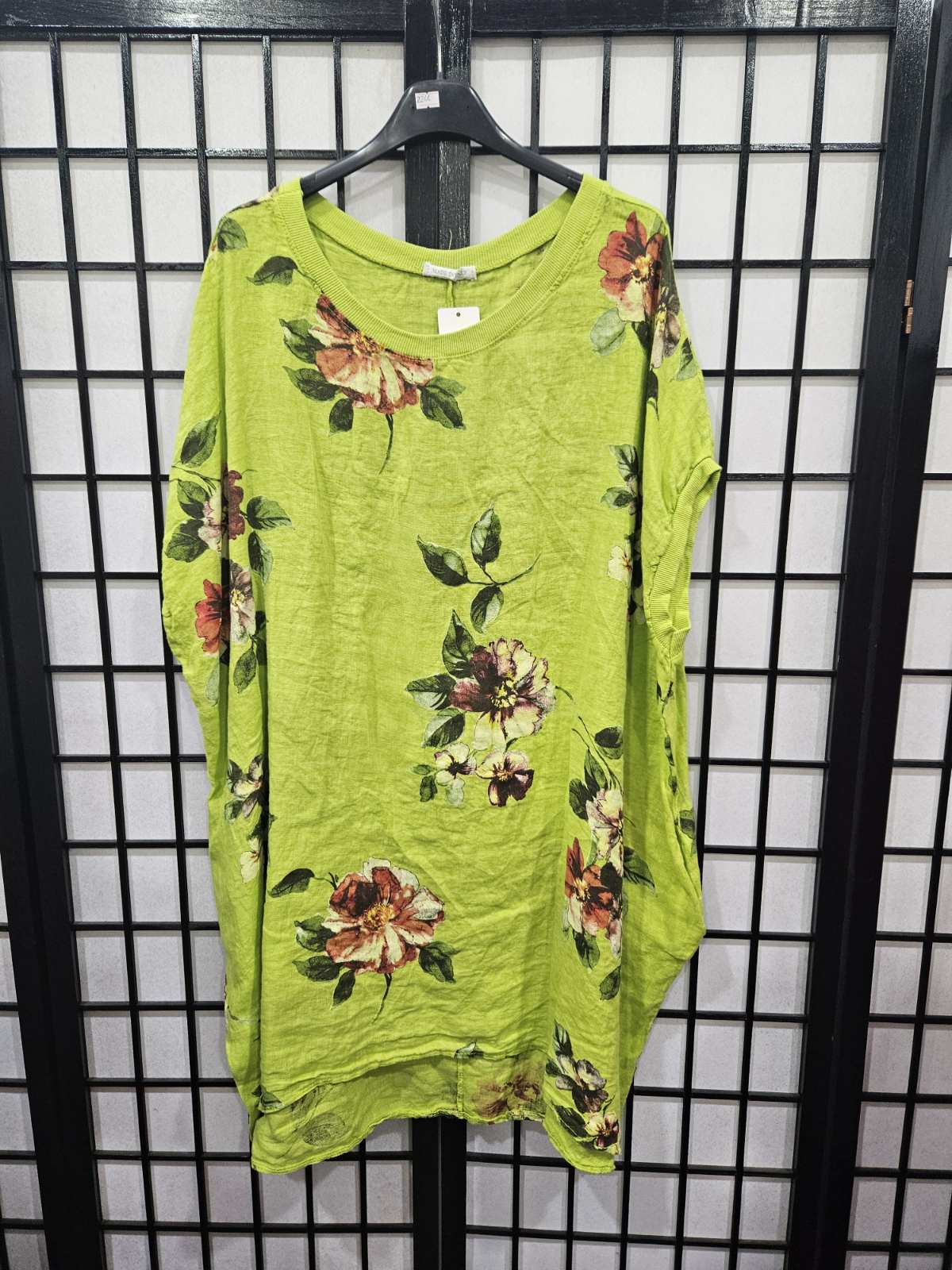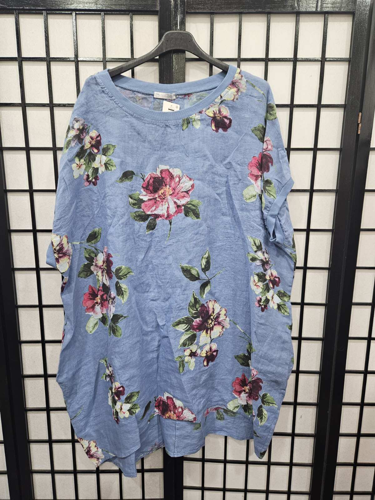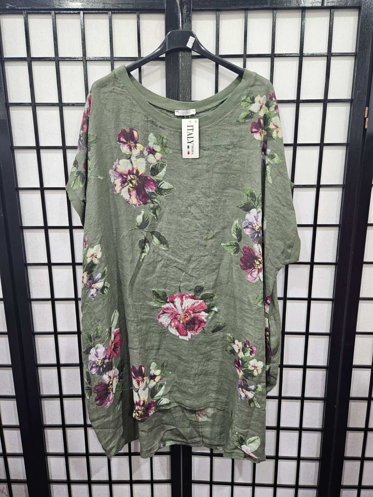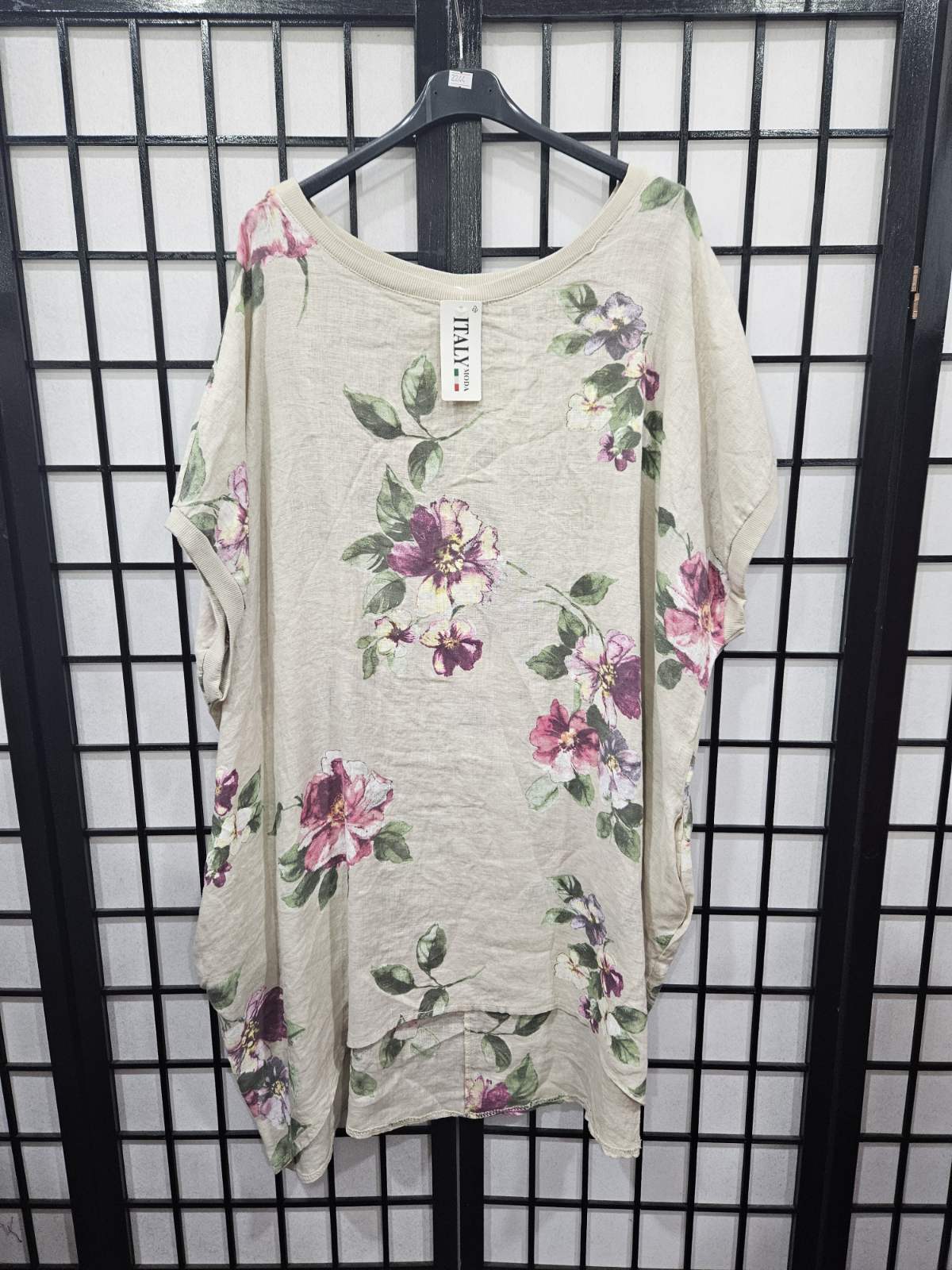 Italian Floral Linen Tunic With Short  Batwing Sleeves - 2244