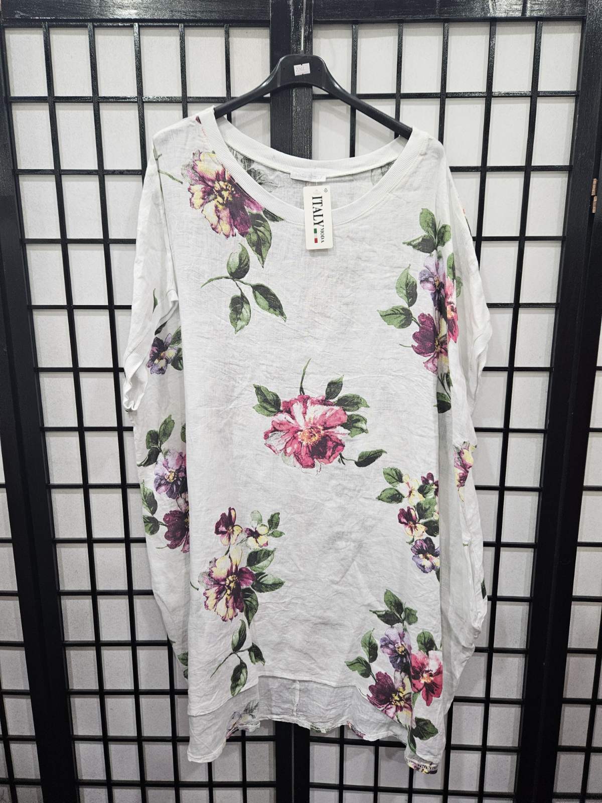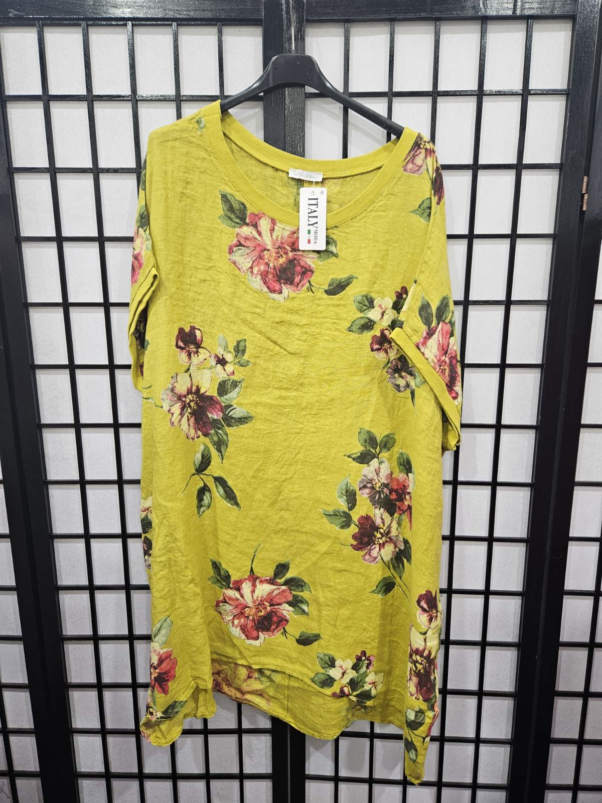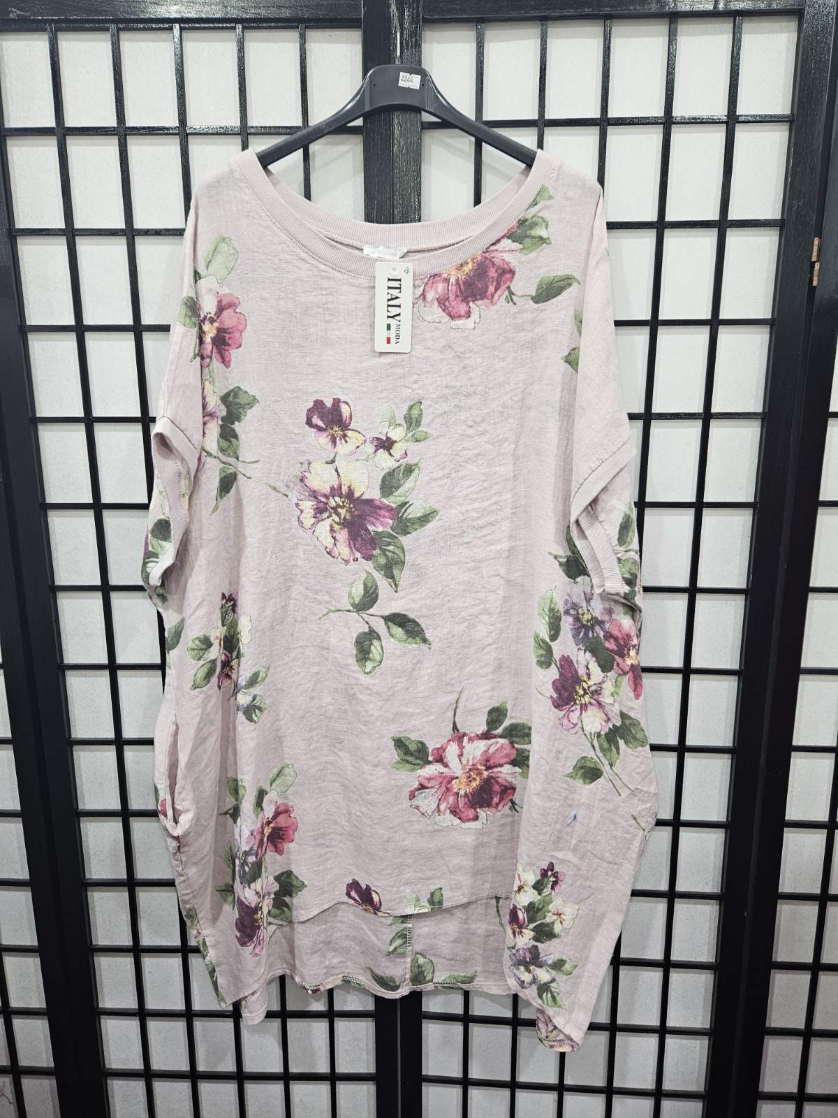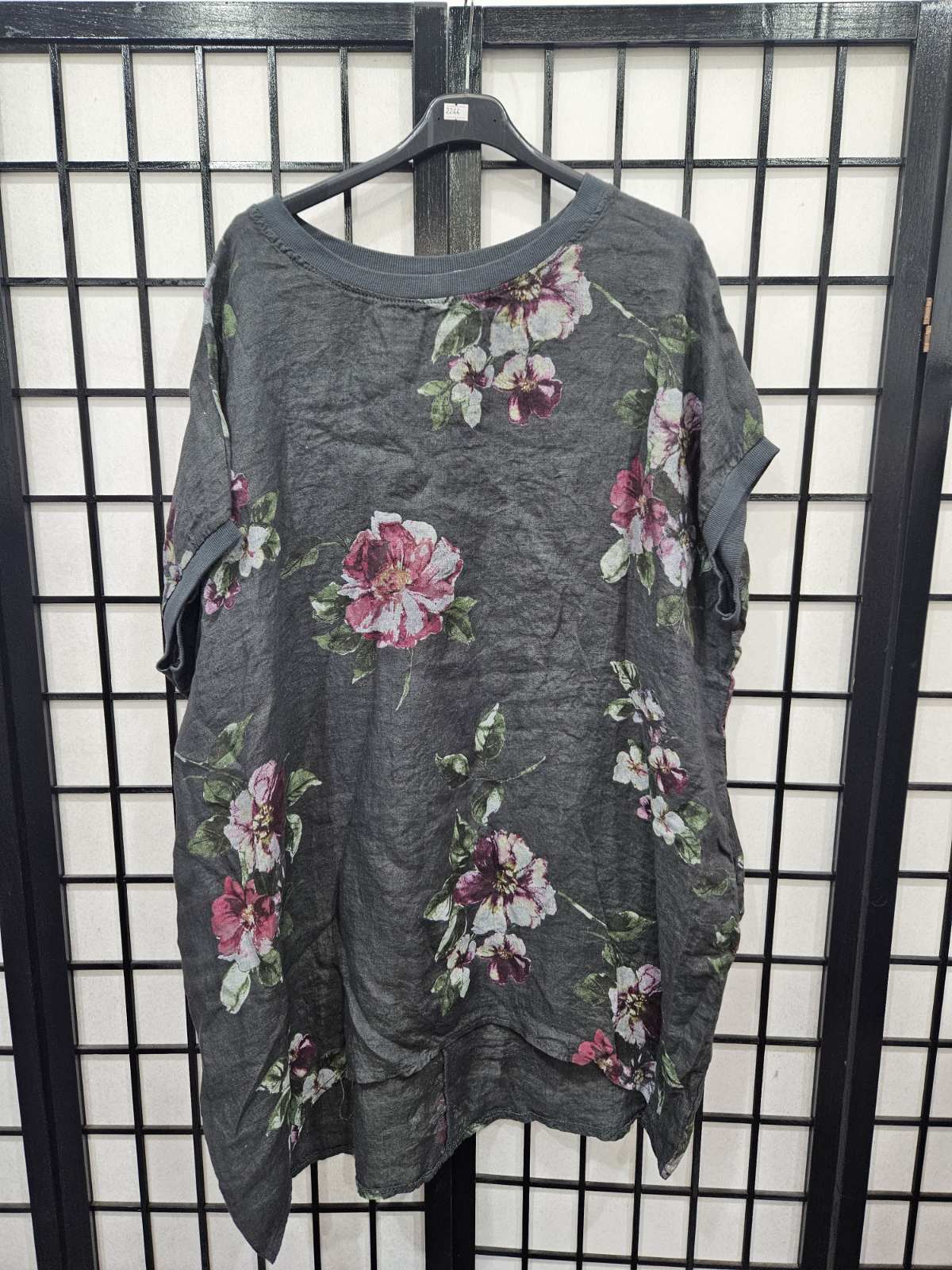 Italian Floral Linen Tunic With Short  Batwing Sleeves - 2244