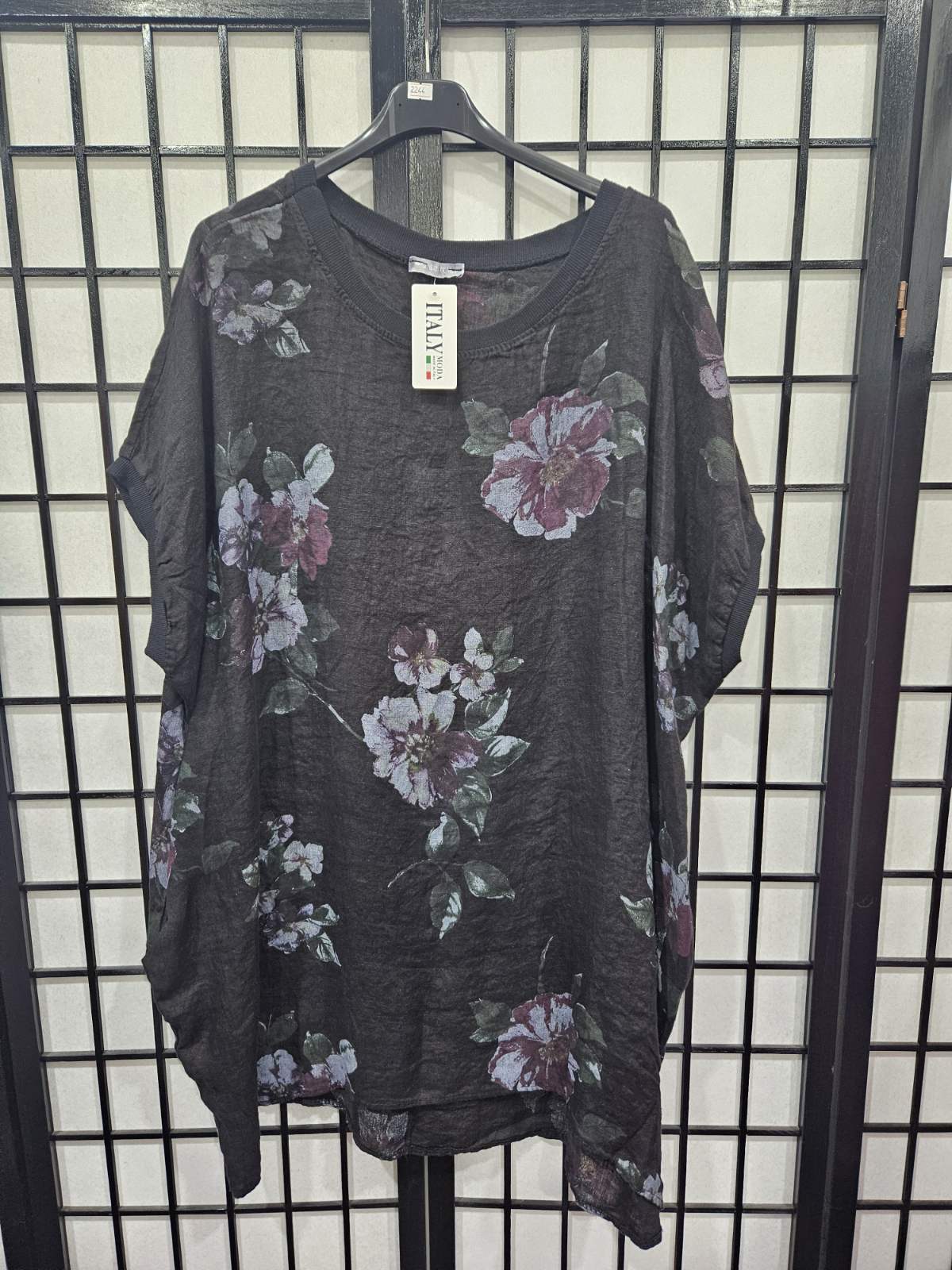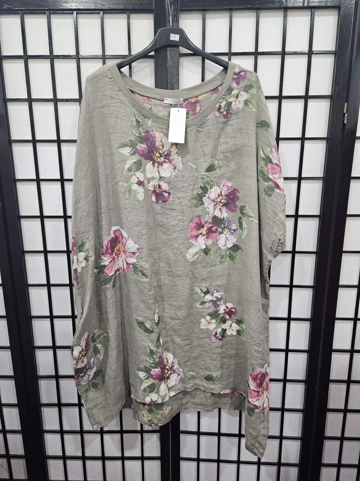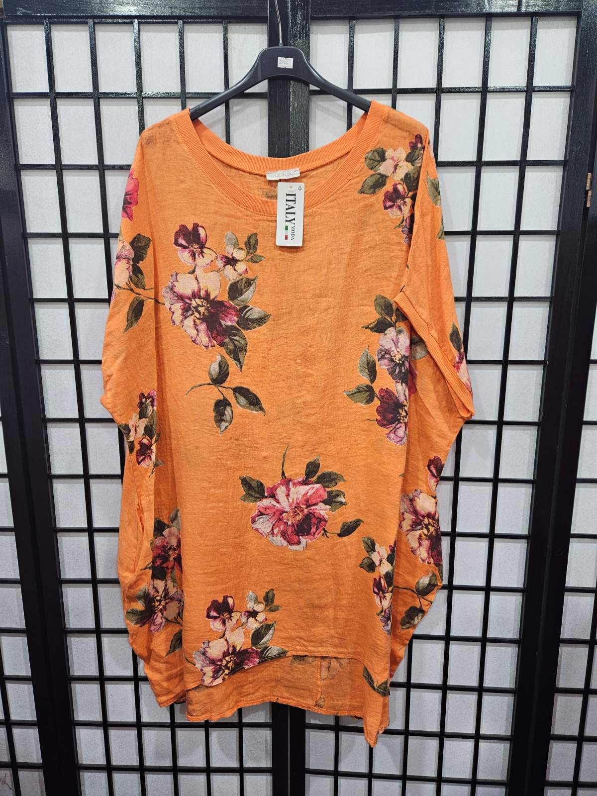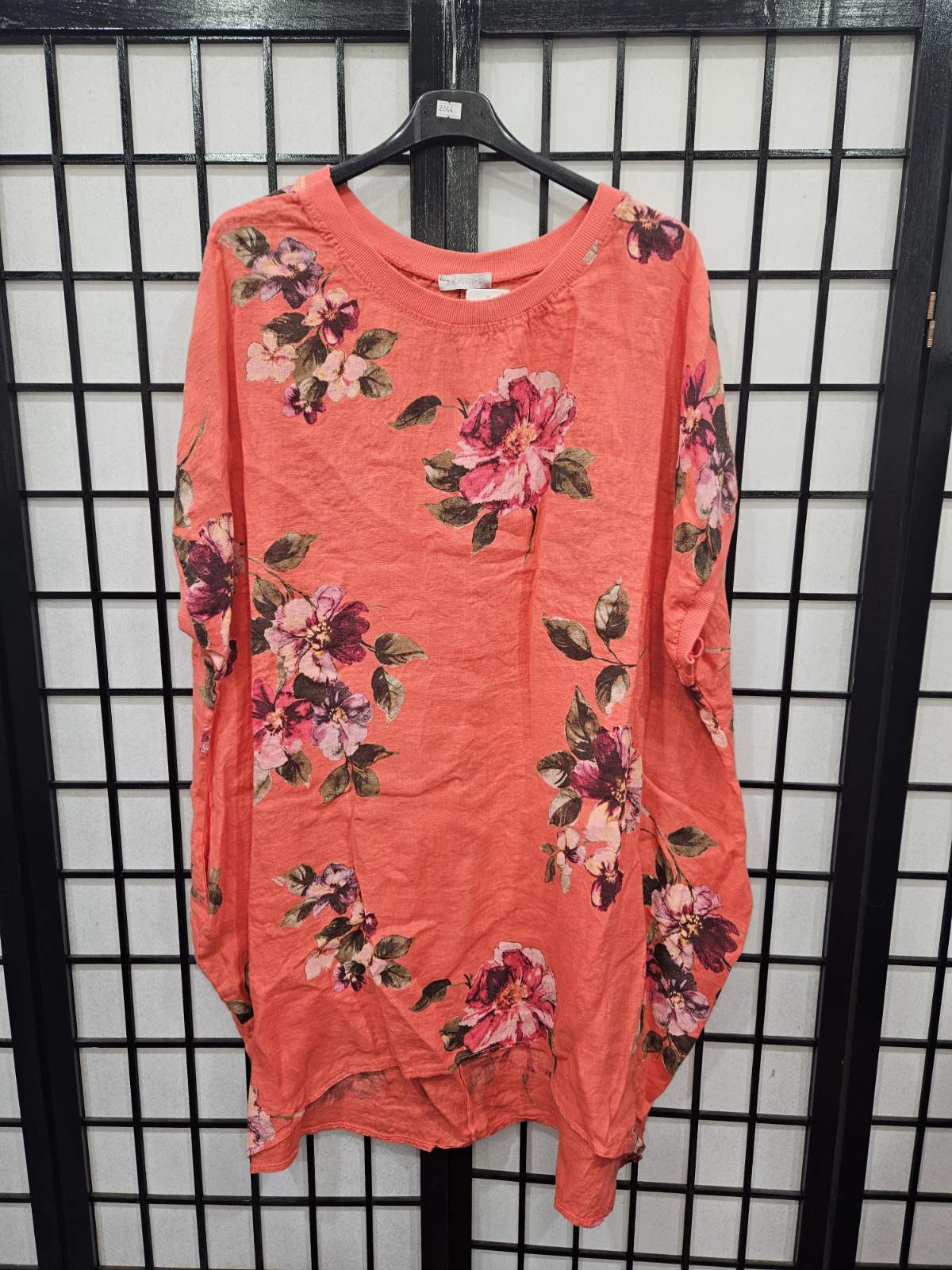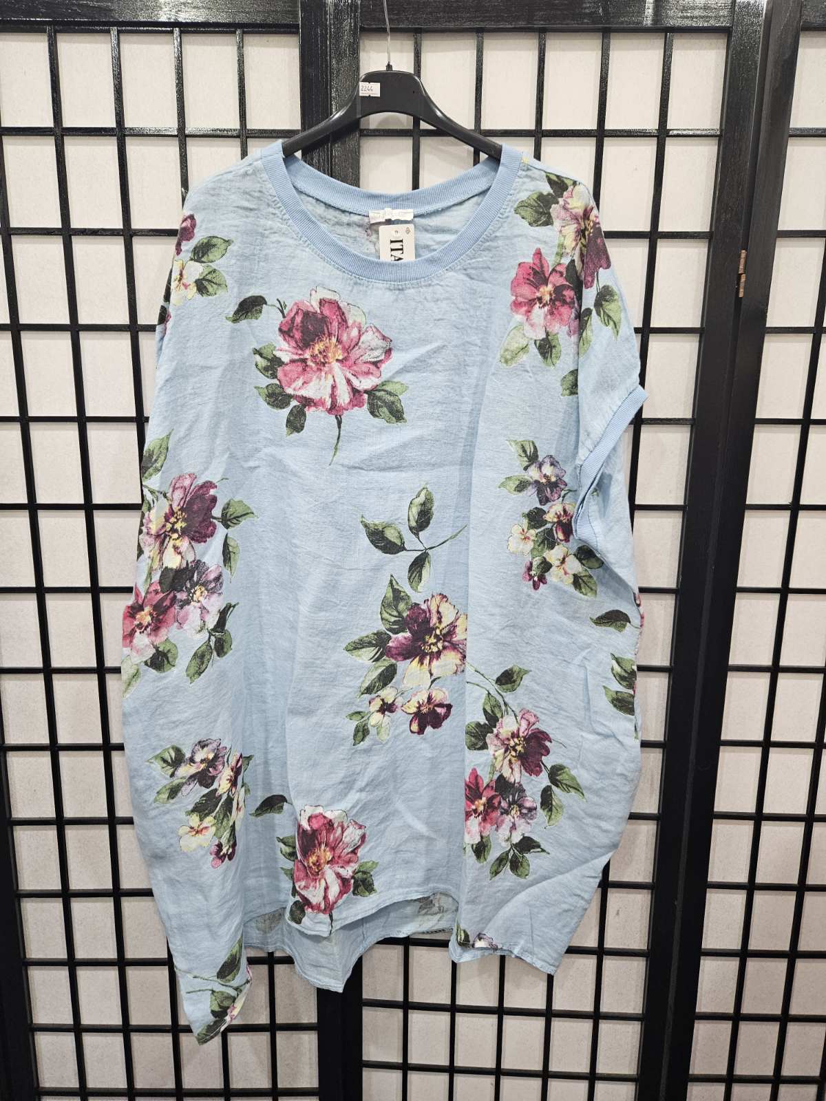 Italian Floral Linen Tunic With Short  Batwing Sleeves - 2244