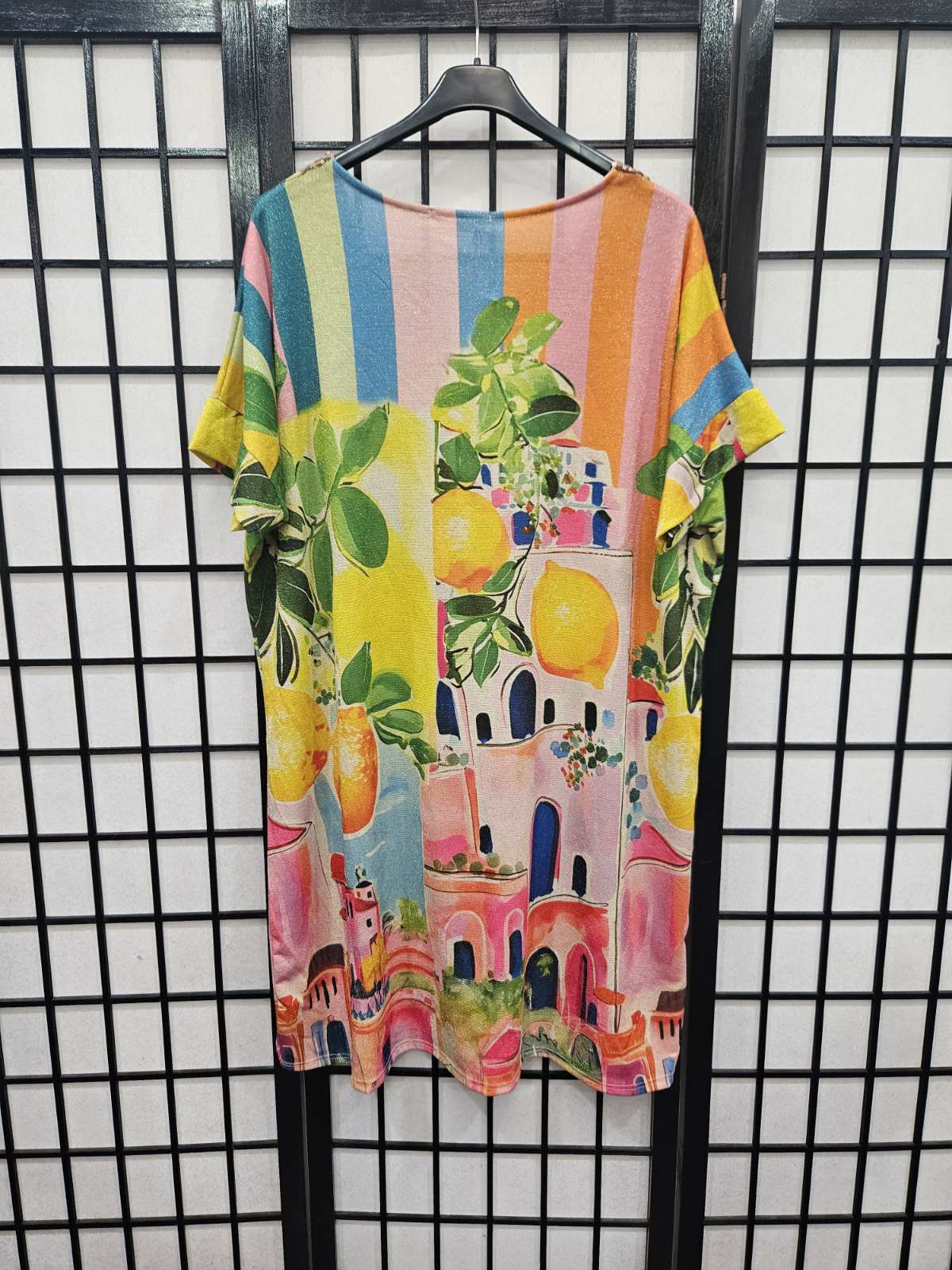 Italian Short Sleeve Sequin V Neck Printed Knitted Tunic - 5217
