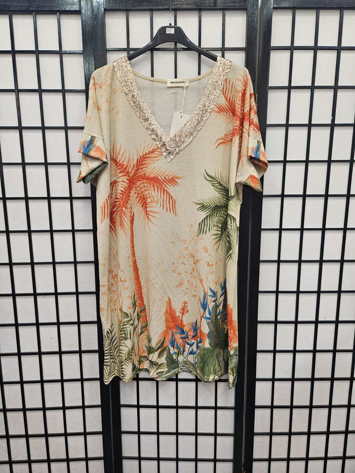 Italian Short Sleeve Sequin V Neck Printed Knitted Tunic - 5218