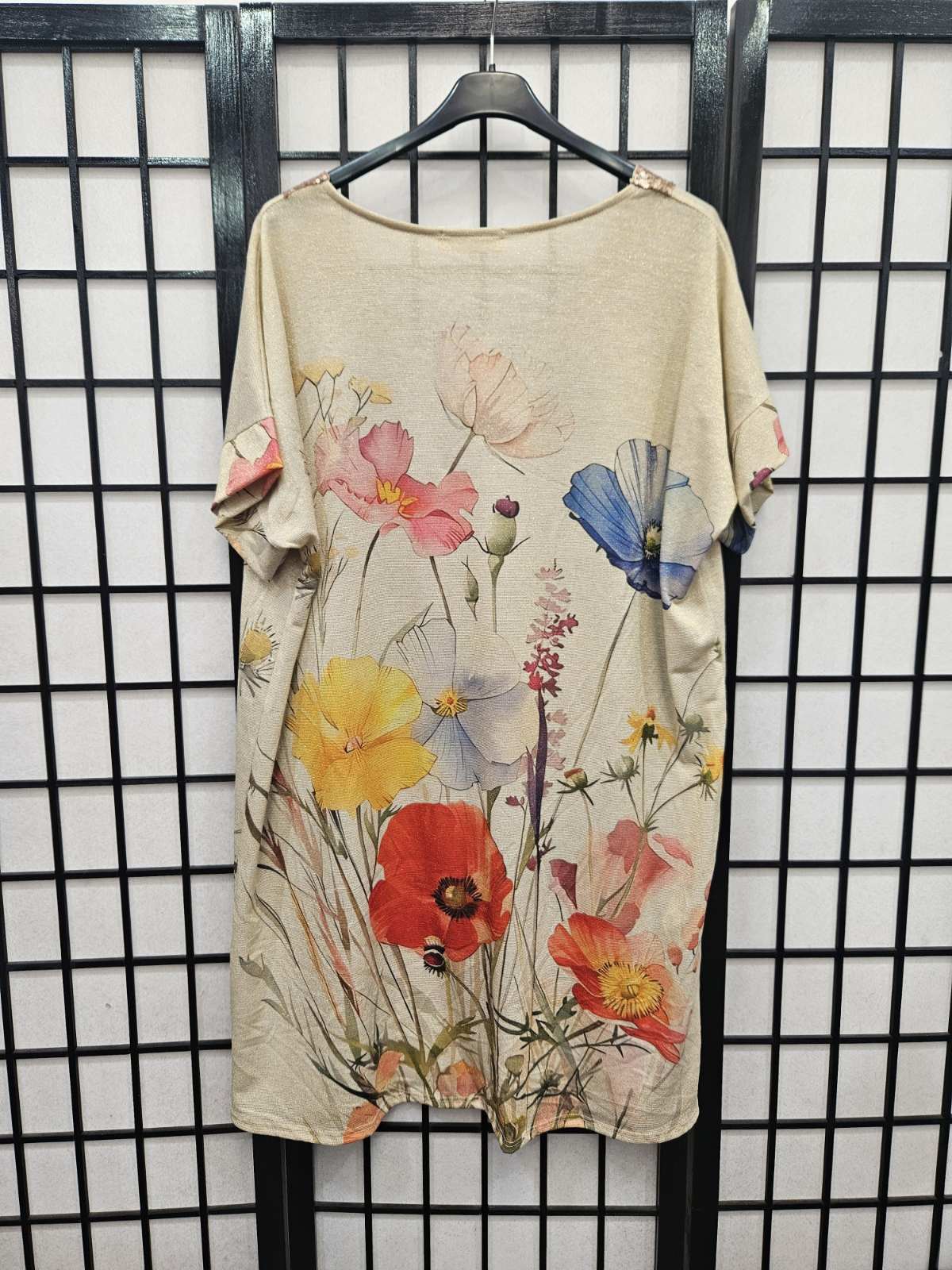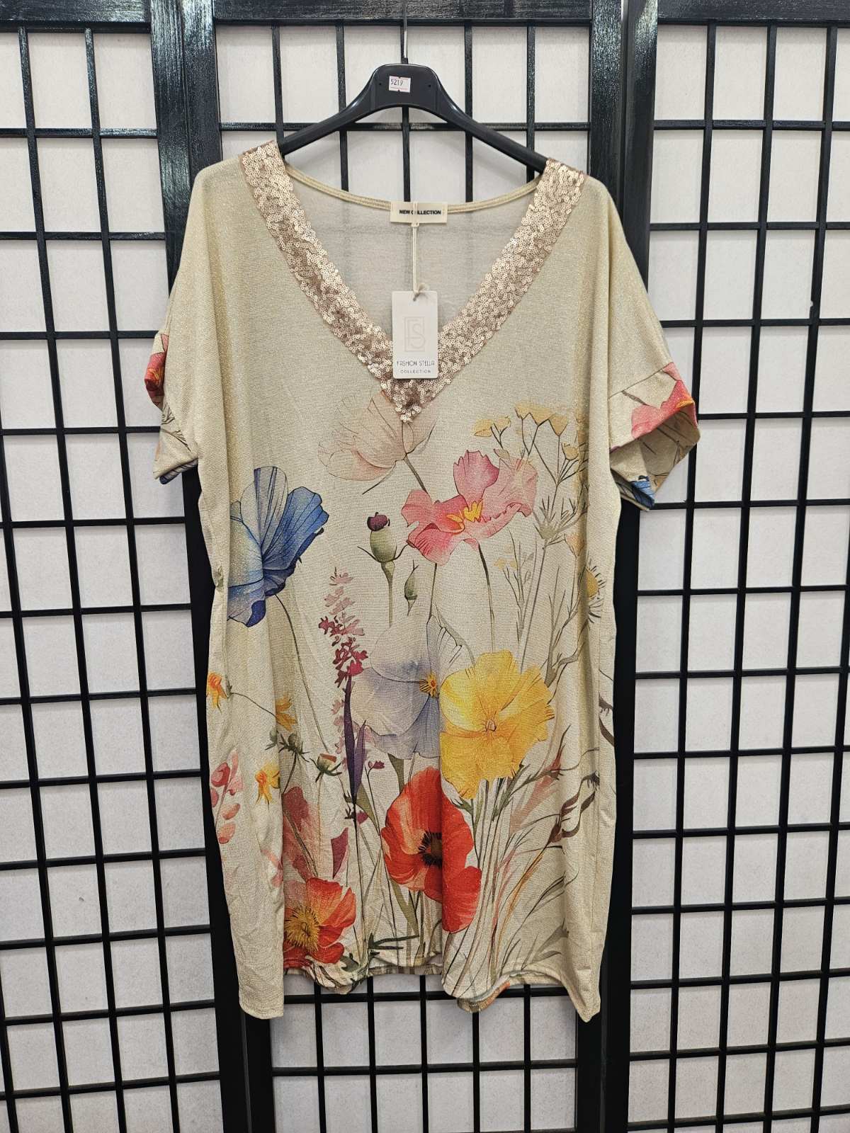 Italian Short Sleeve Sequin V Neck Printed Knitted Tunic - 5219