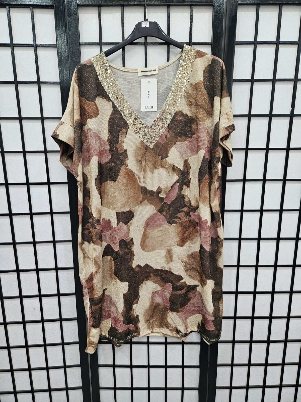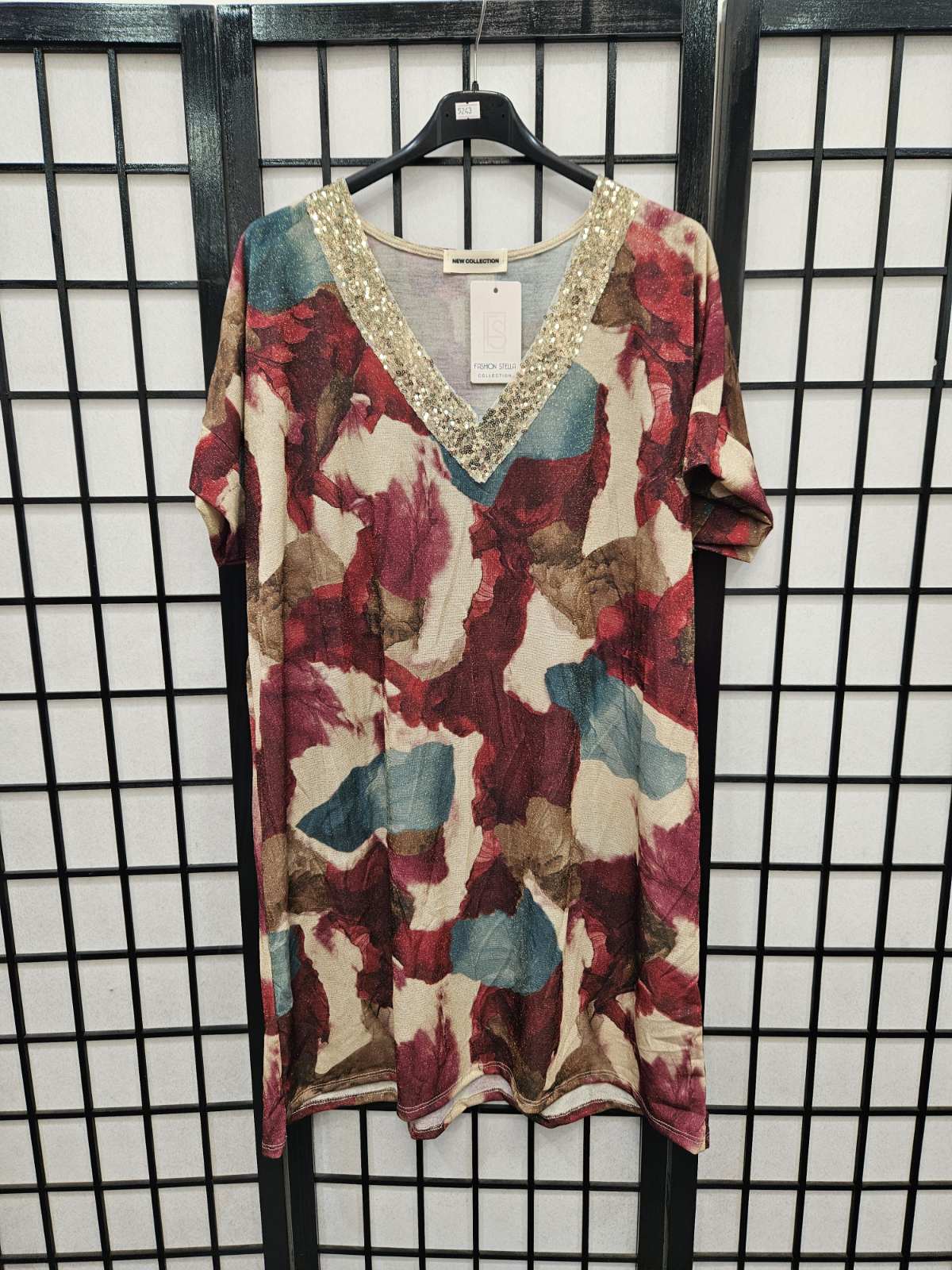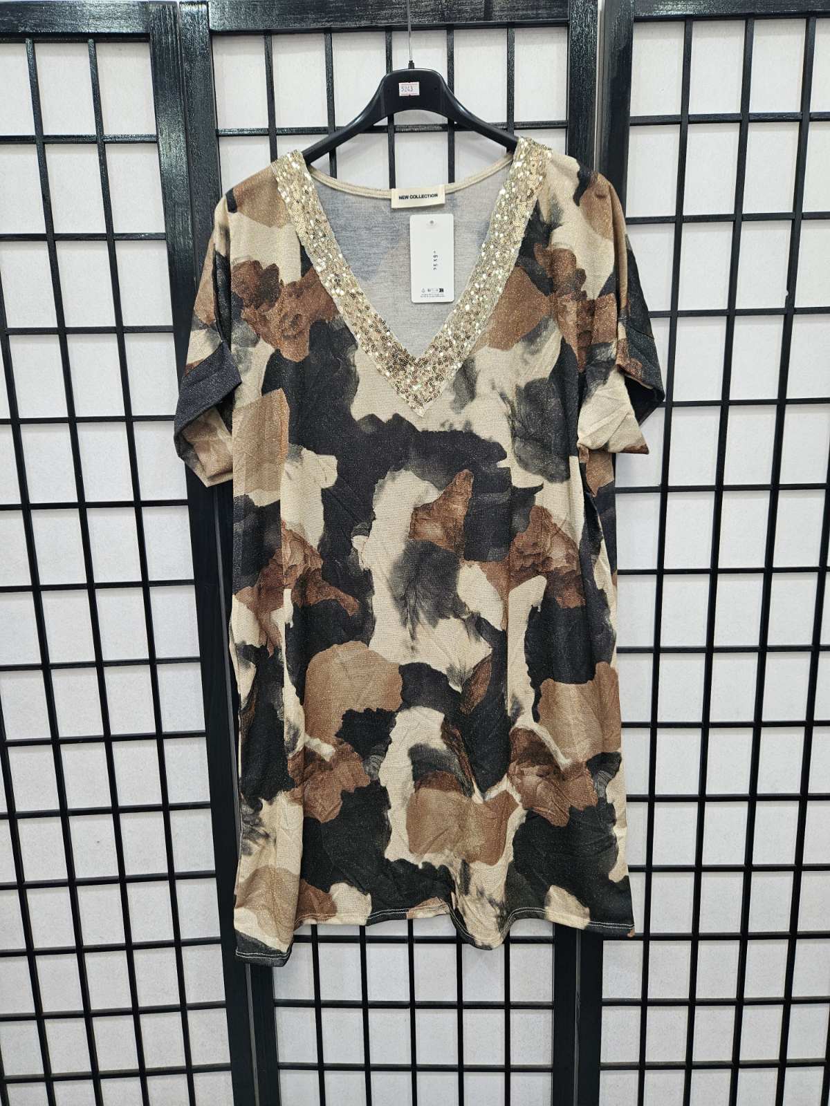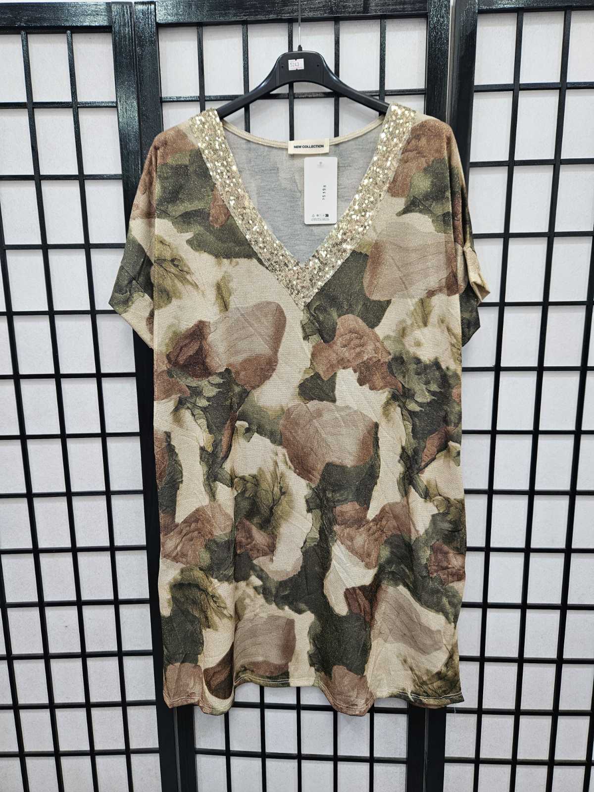 Italian Short Sleeve Sequin V Neck Printed Knitted Tunic - 5243