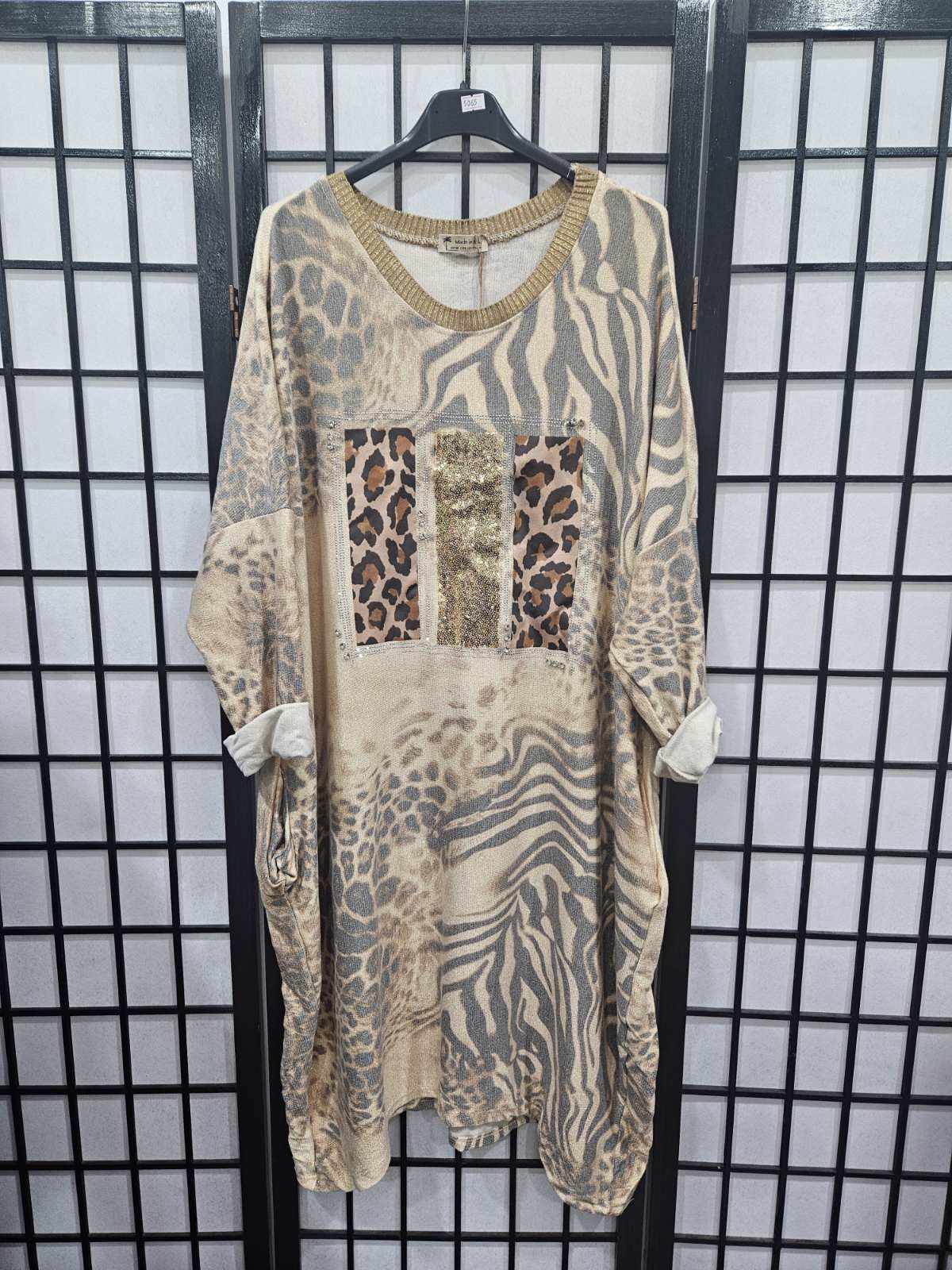 Italian Animal Print Fine Knit Dress With Animal And Diamante Design On Front- 5065